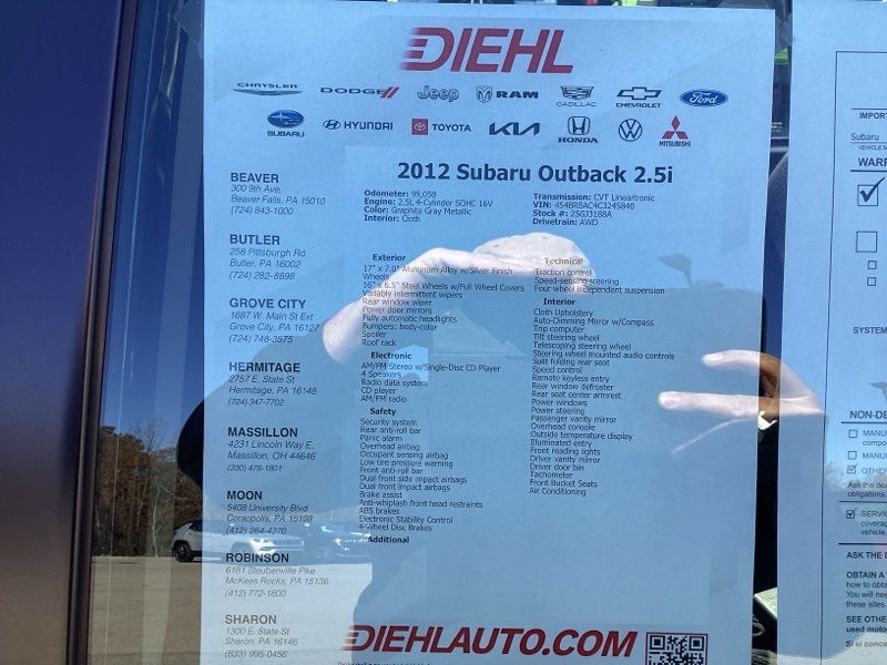 Graphite Gray Metallic 2012 Subaru Outback 2.5i 4D Sport Utility AWD 2.5L 4-Cylinder SOHC 16V CVT Lineartronic