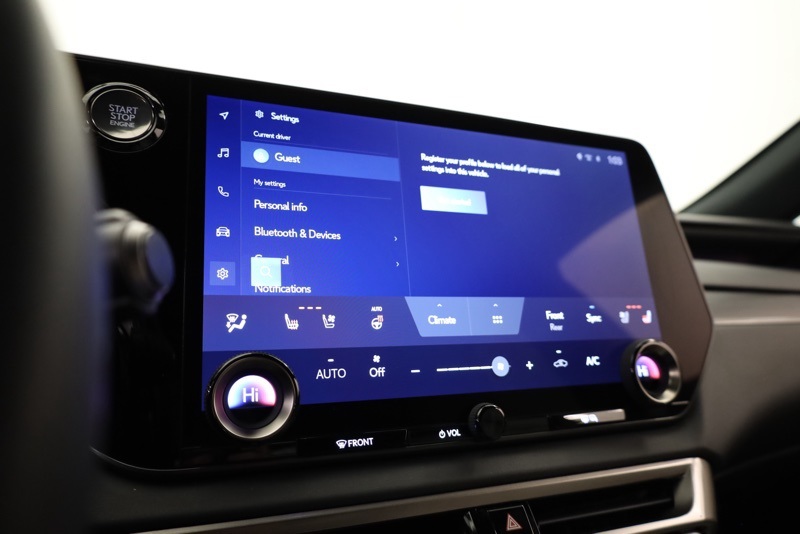 **ALL WHEEL DRIVE**, **BLUETOOTH HANDS FREE PHONE**, **LEATHER**, **MOONROOF**, **BACK-UP CAMERA**, **HEATED AND COOLED FRONT SEATS**, **CLEAN CARFAX ONE OWNER**, **FACTORY NAVIGATION**, **21" ALLOY WHEELS**, **BACK UP CAMERA CLEANER**, **HEADS UP DISPLAY**, **POWER LIFTGATE**, **APPLE CARPLAY / ANDROID AUTO**, **AUTO HIGH BEAMS**, **LANE KEEP ASSIST**, **ADAPTIVE CRUISE CONTROL**, AWD, Birch w/Black Open Pore w/NuLuxe Seat Trim, 12 Speakers, 3.33 Axle Ratio, 4-Wheel Disc Brakes, ABS brakes, Air Conditioning, Alloy wheels, AM/FM radio: SiriusXM, Anti-whiplash front head restraints, Auto High-beam Headlights, Auto-dimming door mirrors, Auto-dimming Rear-View mirror, Automatic temperature control, Brake assist, Bumpers: body-color, Compass, Delay-off headlights, Driver door bin, Driver vanity mirror, Dual front impact airbags, Dual front side impact airbags, Electronic Stability Control, Emergency communication system: Safety Connect (10-year trial), Exterior Parking Camera Rear, Four wheel independent suspension, Front anti-roll bar, Front Bucket Seats, Front Center Armrest, Front dual zone A/C, Front fog lights, Front reading lights, Fully automatic headlights, Garage door transmitter: HomeLink, Genuine wood console insert, Heated door mirrors, Heated Front Bucket Seats, Heated front seats, Illuminated entry, Leather Shift Knob, Low tire pressure warning, Navigation System, NuLuxe Seat Trim, Occupant sensing airbag, Outside temperature display, Overhead airbag, Overhead console, Panic alarm, Passenger door bin, Passenger vanity mirror, Power door mirrors, Power driver seat, Power Liftgate, Power passenger seat, Power steering, Power Tilt & Slide Moonroof, Power windows, Radio data system, Radio: Lexus Interface w/9.8" HD Touchscreen Display, Rain sensing wipers, Rear air conditioning, Rear anti-roll bar, Rear reading lights, Rear seat center armrest, Rear side impact airbag, Rear window defroster, Rear window wiper, Remote keyless entry, Security system, Speed control, Speed-sensing steering, Split folding rear seat, Spoiler, Steering wheel mounted audio controls, Tachometer, Telescoping steering wheel, Tilt steering wheel, Traction control, Trip computer, Turn signal indicator mirrors, Variably intermittent wipers, Wireless Apple CarPlay/Wireless Android Auto, Wireless Charger. CARFAX One-Owner. Clean CARFAX. Nightfall Mica 2023 Lexus RX 350 AWD 8-Speed Automatic 2.4L I4 PDI Turbocharged DOHC 16V LEV3-SULEV30 275hp